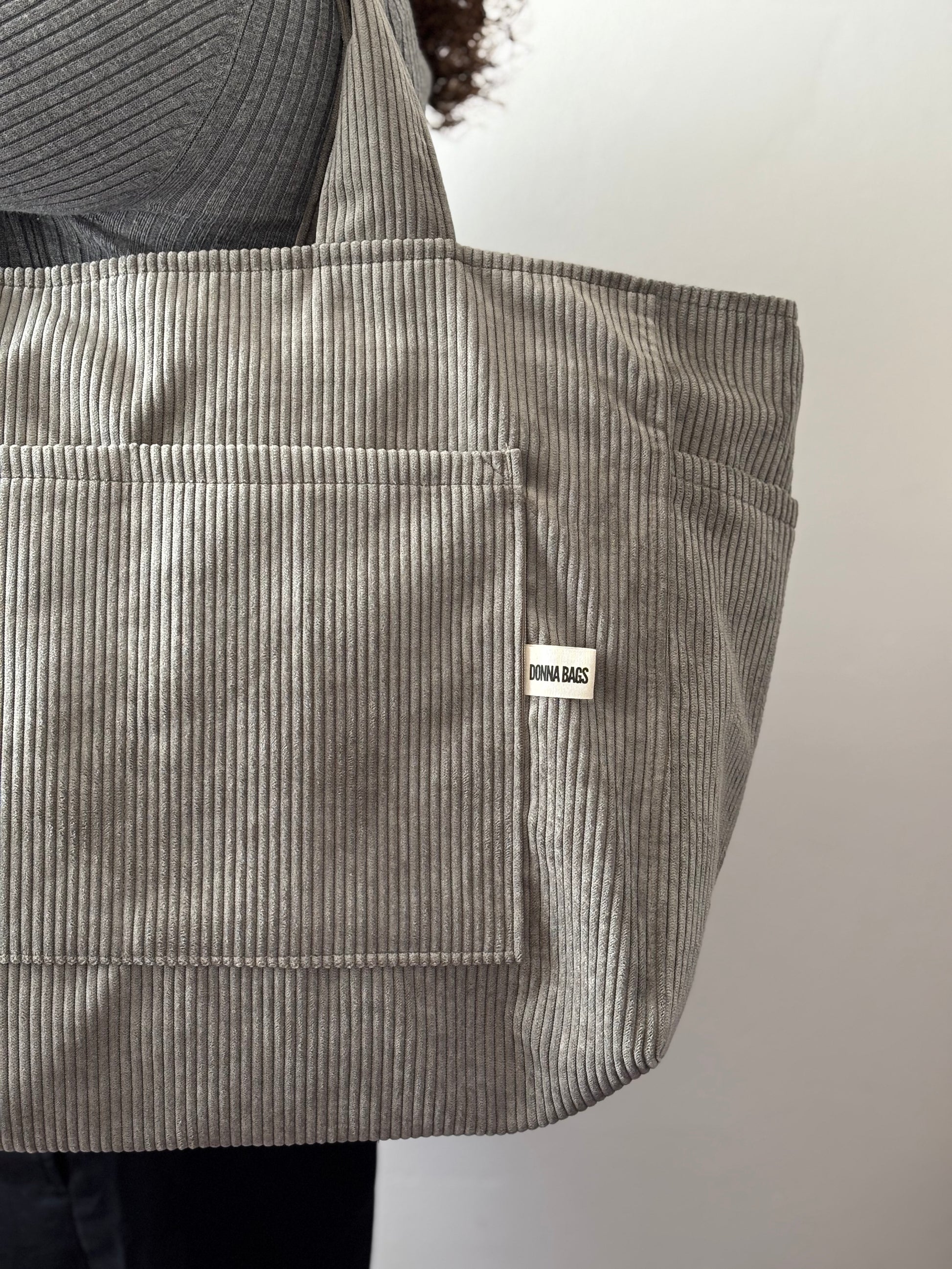 Mala de ombro em bombazine com quatro bolsos externos e bolso interno. Forro acolchoado. Fecho com zíper.