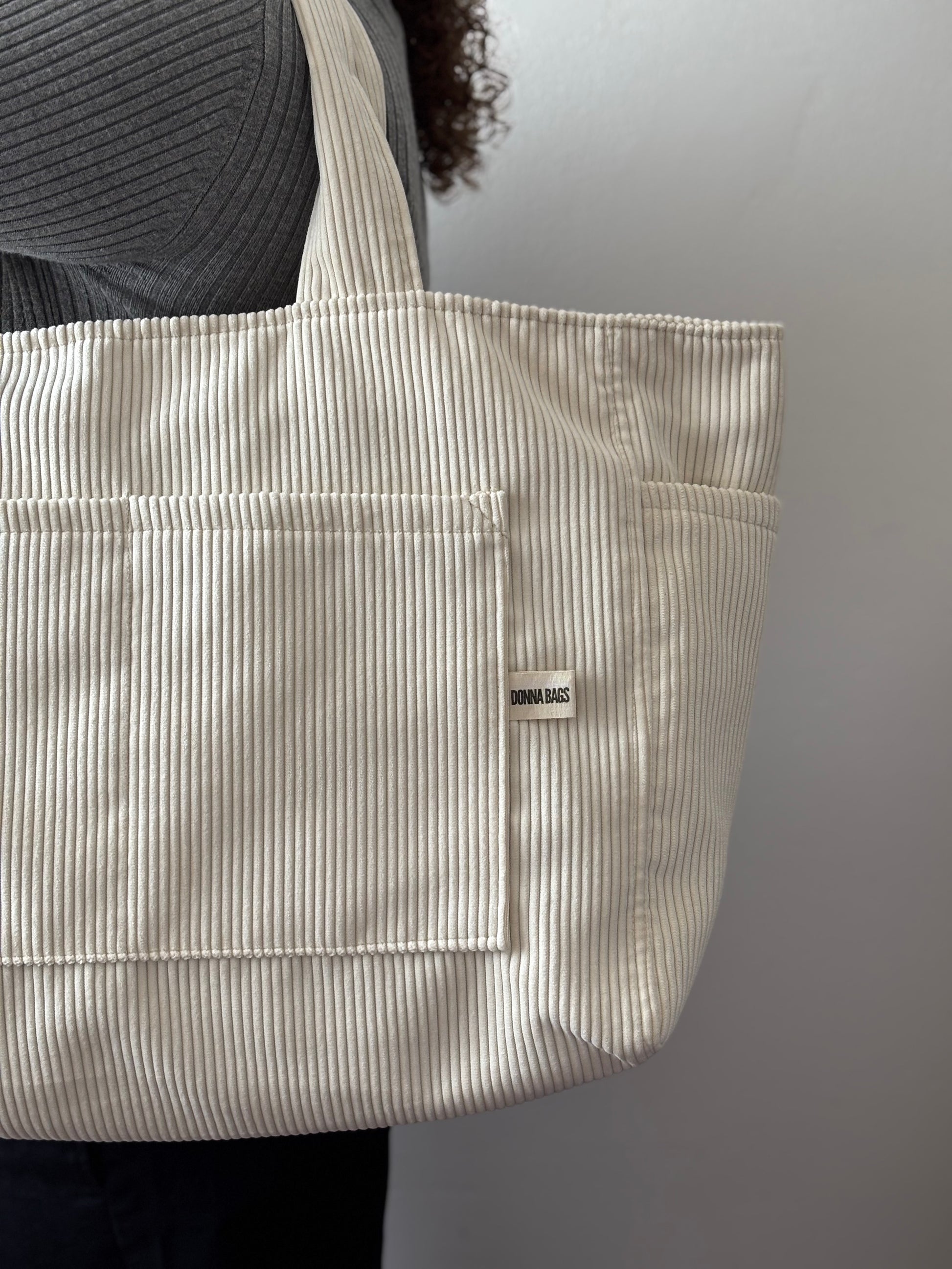 Mala de ombro em bombazine com quatro bolsos externos e bolso interno. Forro acolchoado. Fecho com zíper.