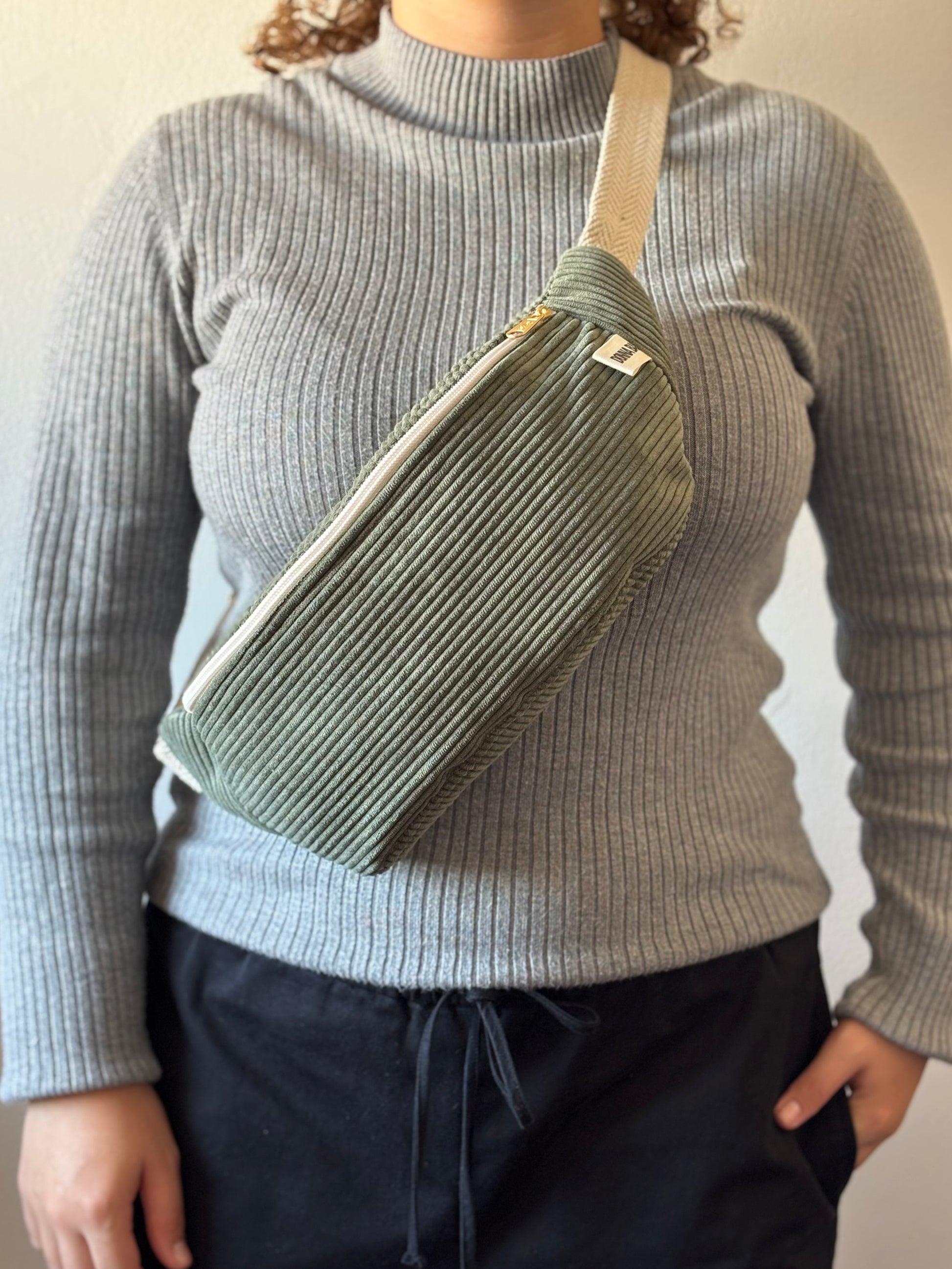Mala em bombazine estilo pochete com alça regulável. Forro acolchoado e bolso interno. Fecho com zíper.