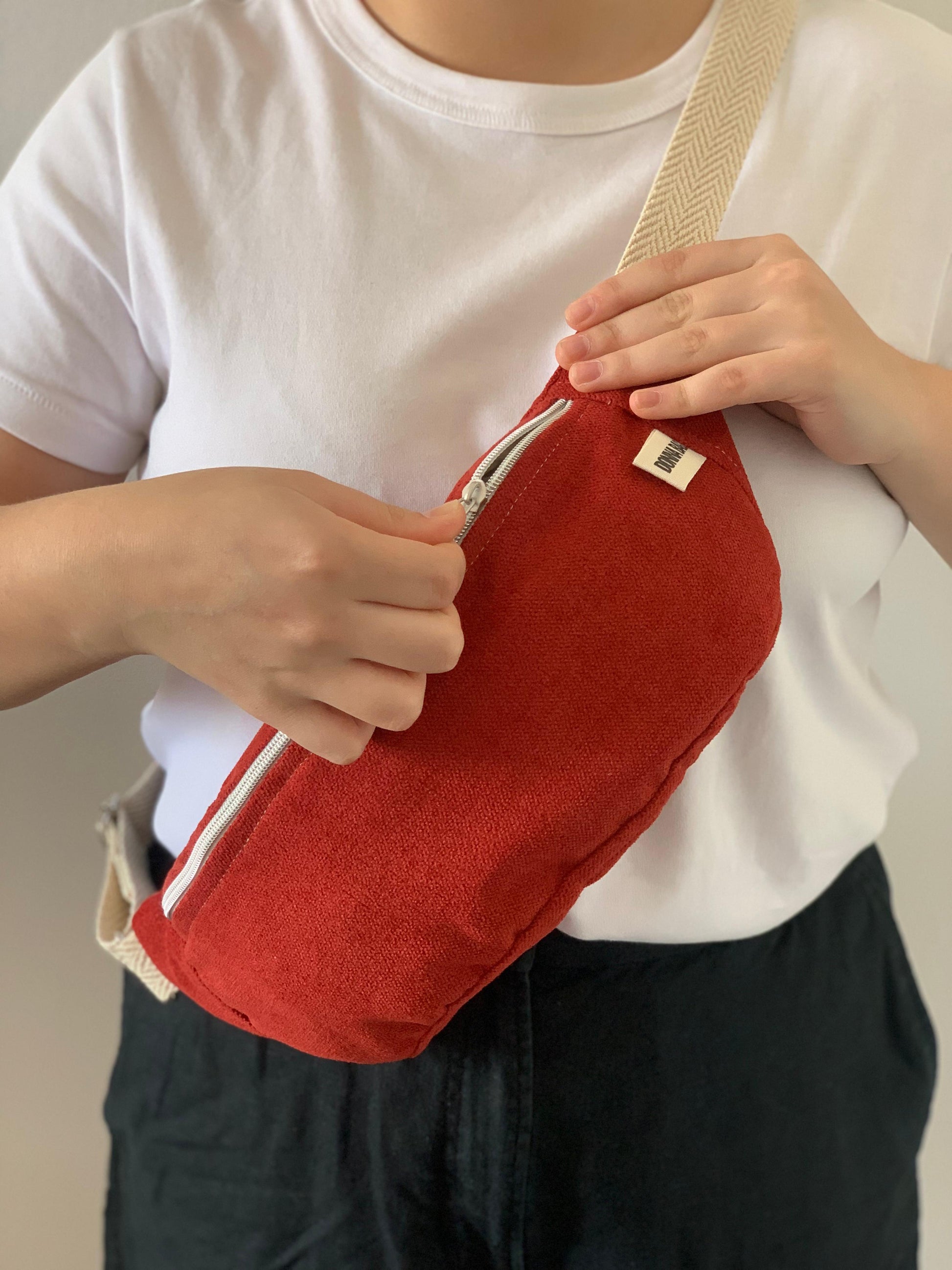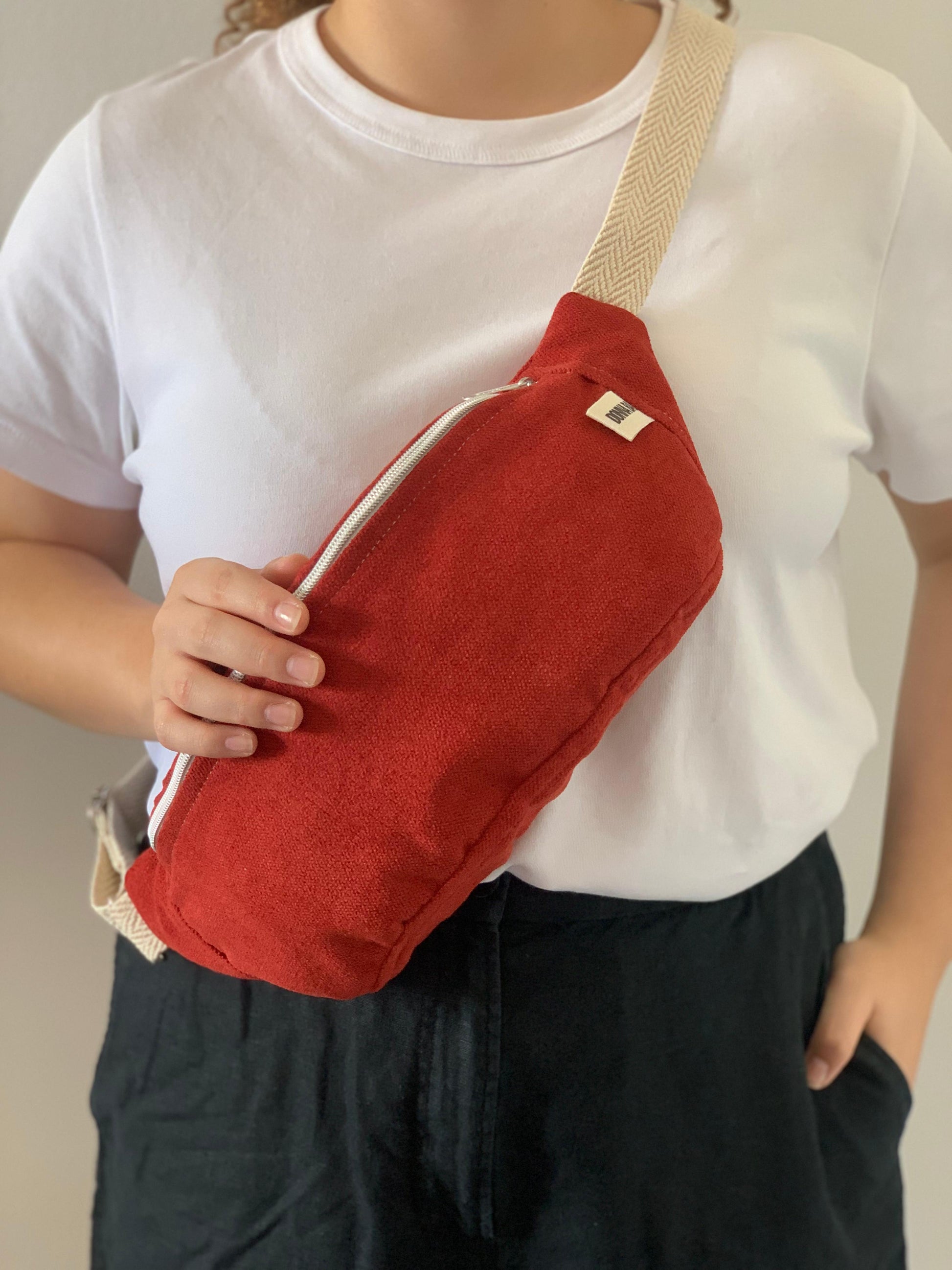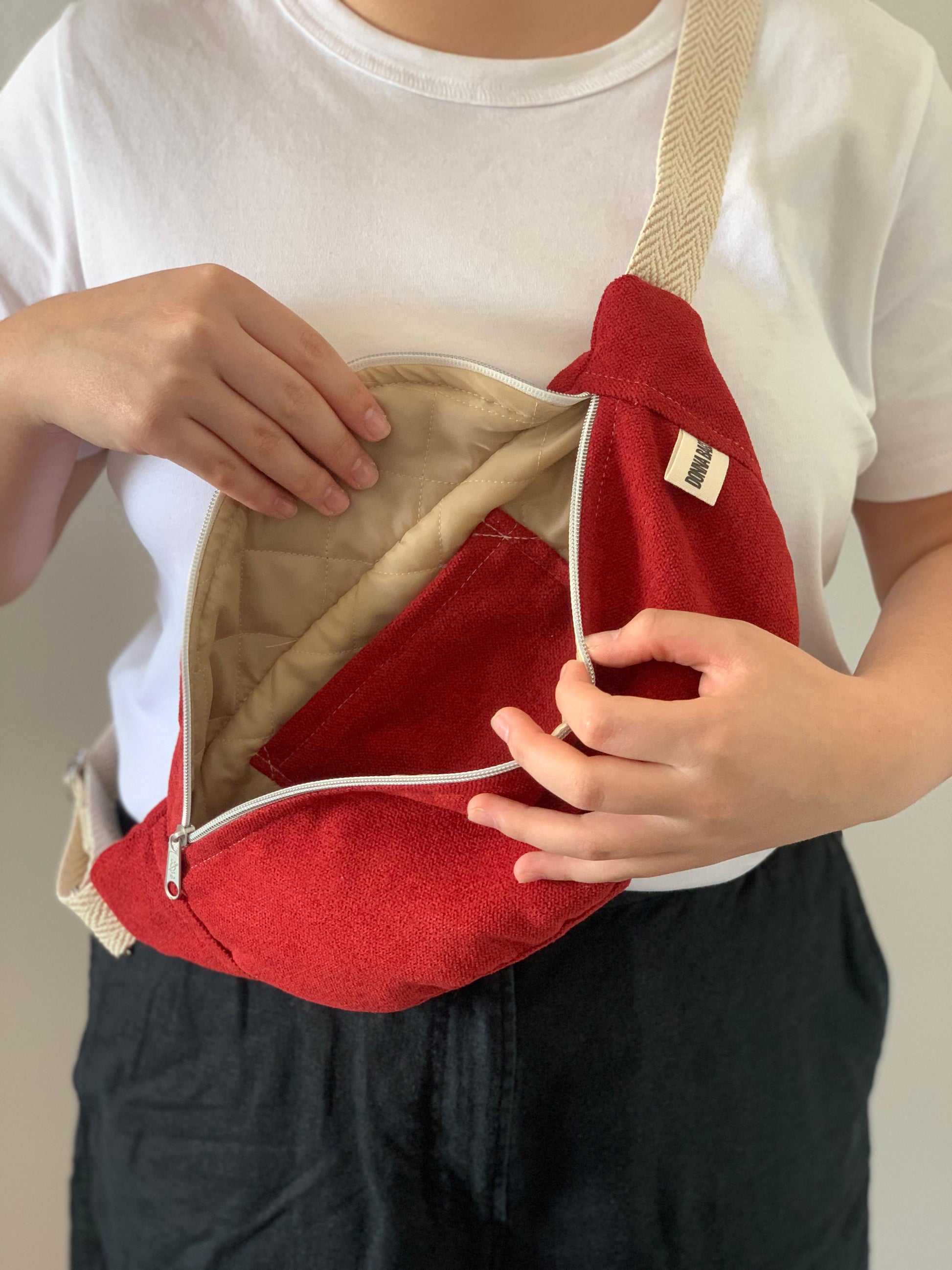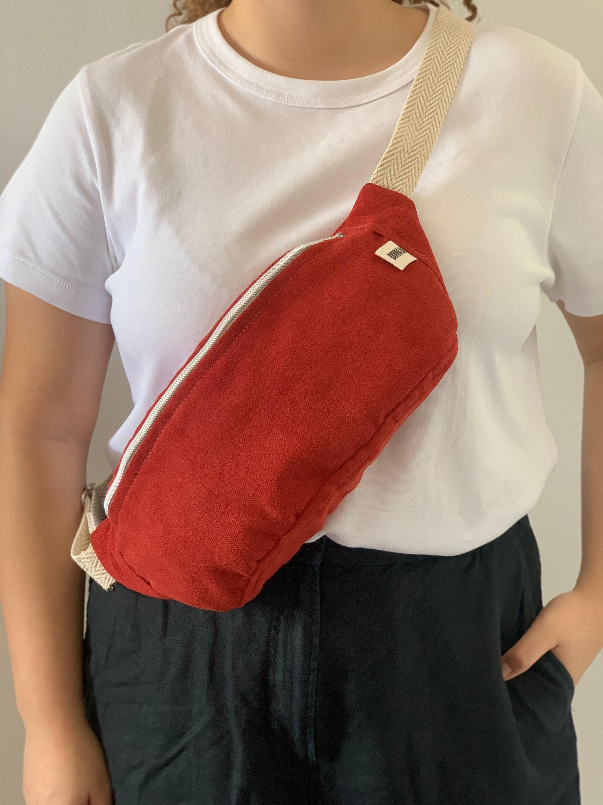 Mala em veludo rústico estilo pochete. Forro acolchoado e bolso interno. Fecho com zíper metálico.